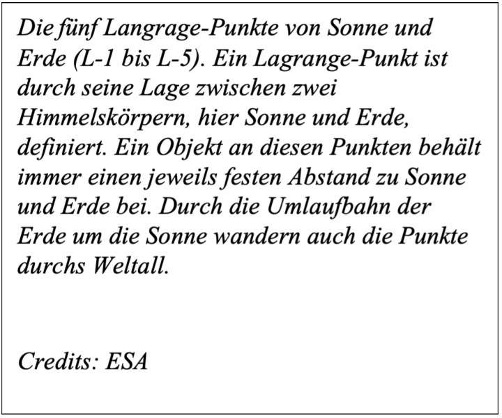 In-situ bedeutet wörtlich „an Ort und Stelle“. Für die Satelliten mit den Messgeräten heißt das: Sie befinden sich direkt im Sonnenwind, statt aus der Ferne Daten zu sammeln. Die Satelliten sind am sogenannten Lagrange-Punkt 1 positioniert, welcher rund 1,5 Millionen Kilometer von der Erde entfernt ist. Lagrange-Punkte, von denen es jeweils fünf verschiedene gibt, werden immer durch ihre Position zu zwei Himmelskörpern definiert. Die physikalischen Kräfte, welche auf ein kleines Objekt am jeweiligen Punkt wirken, gleichen sich aus. Das bedeutet: Ein Satellit am Lagrange-Punkt 1 befindet sich von der Erde aus gesehen immer mit gleichbleibendem Abstand und in gleicher Richtung zur Sonne, ohne Treibstoff aufwenden zu müssen. Der Standort hat jedoch auch einen entscheidenden Nachteil: Die Vorwarnzeit für Sonnenstürme liegt bei 10 bis 30 Minuten. Zu kurz also, um aufwändige Sicherheitsmaßnahmen rechtzeitig umzusetzen.